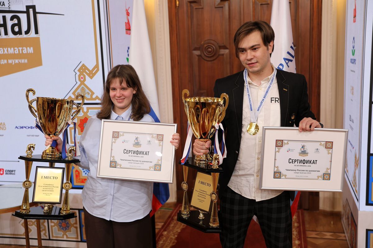 Анна Шухман и Арсений Нестеров с чемпионскими кубками и автомобильными сертификатами